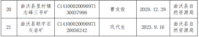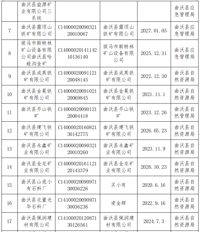 为做好全县矿山安全生产监管工作,防范矿山重大安全风险,依据《中共中央办公厅 国务院办公厅关于进一步加强矿山安全生产工作的意见》《曲沃县非煤矿山停工停产安全监管“六条”硬措施》等文件要求,现将我县21座非煤矿山(停产停建矿山9座,采矿权过期矿山12座)日常安全监管主体进行公示: